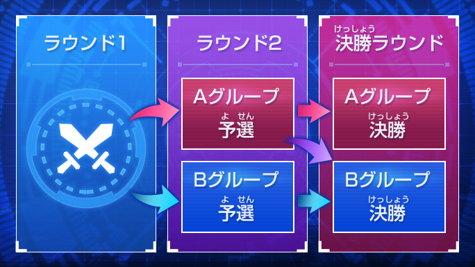 ※ラウンド1に参加しないまま、ラウンド2からグランプリに参加した場合、Bグループに進出した状態での参加となります。